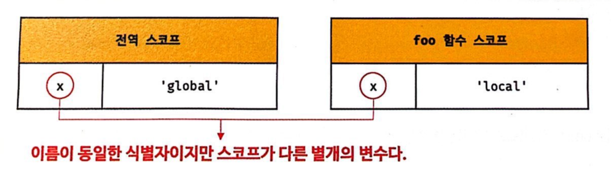 코드의 가장 바깥 영역과 foo함수 내부에 같은 이름을 갖는 x 변수를 선언했고